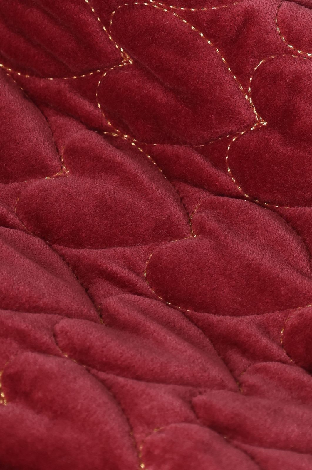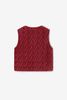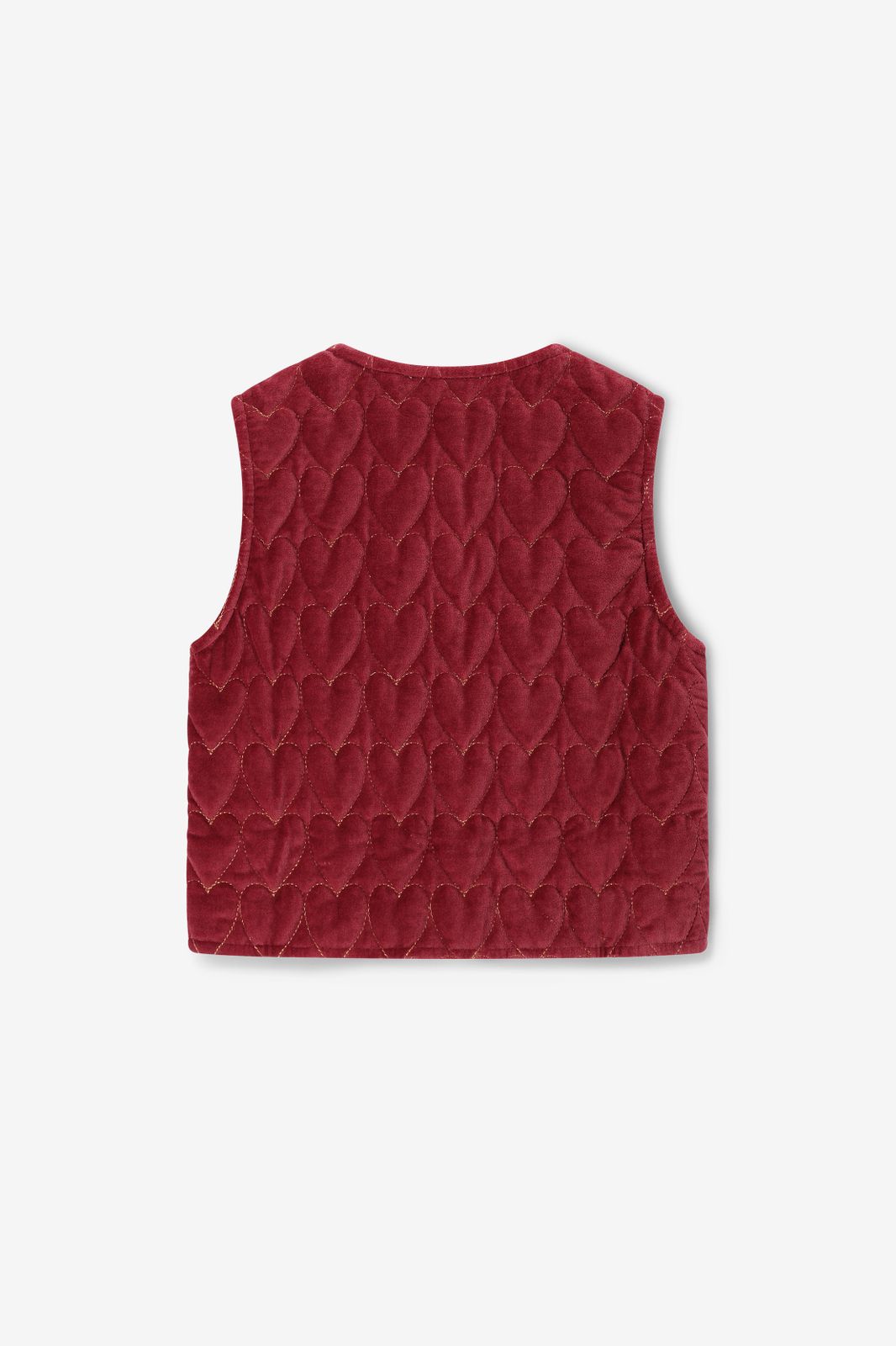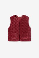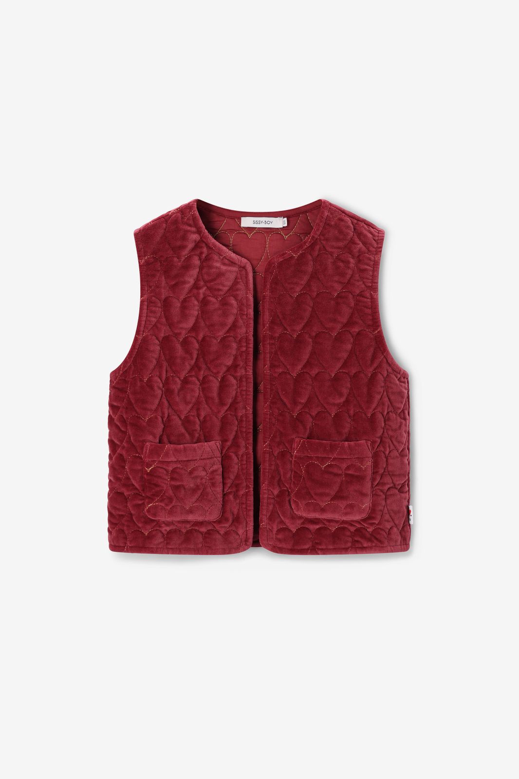 Donkerrood velvet gilet met hartjes van Sissy-Boy. Het gilet heeft een bordeaux rode kleur met all- over goudkleurige quilted hartjes. Verder heeft het gilet een ronde halslijn, twee opgestikte zakken en is het gemaakt van een velvet kwaliteit. Materiaal: 100% katoen.