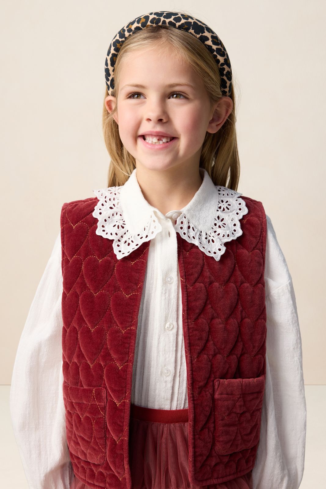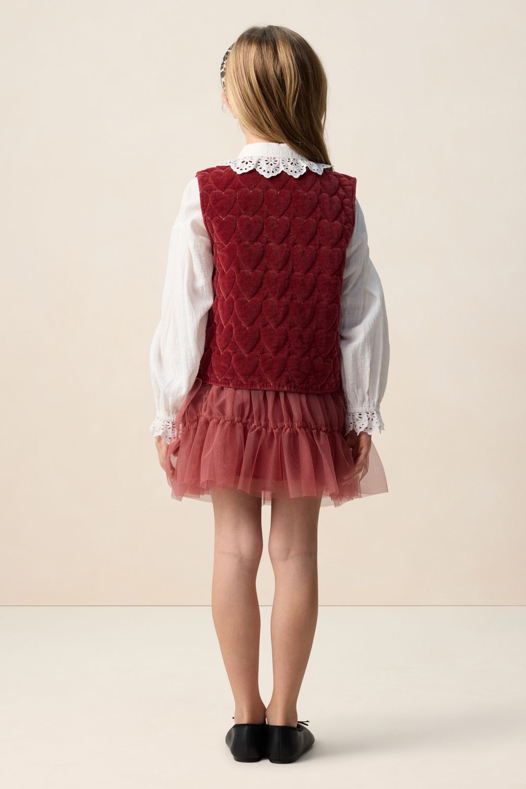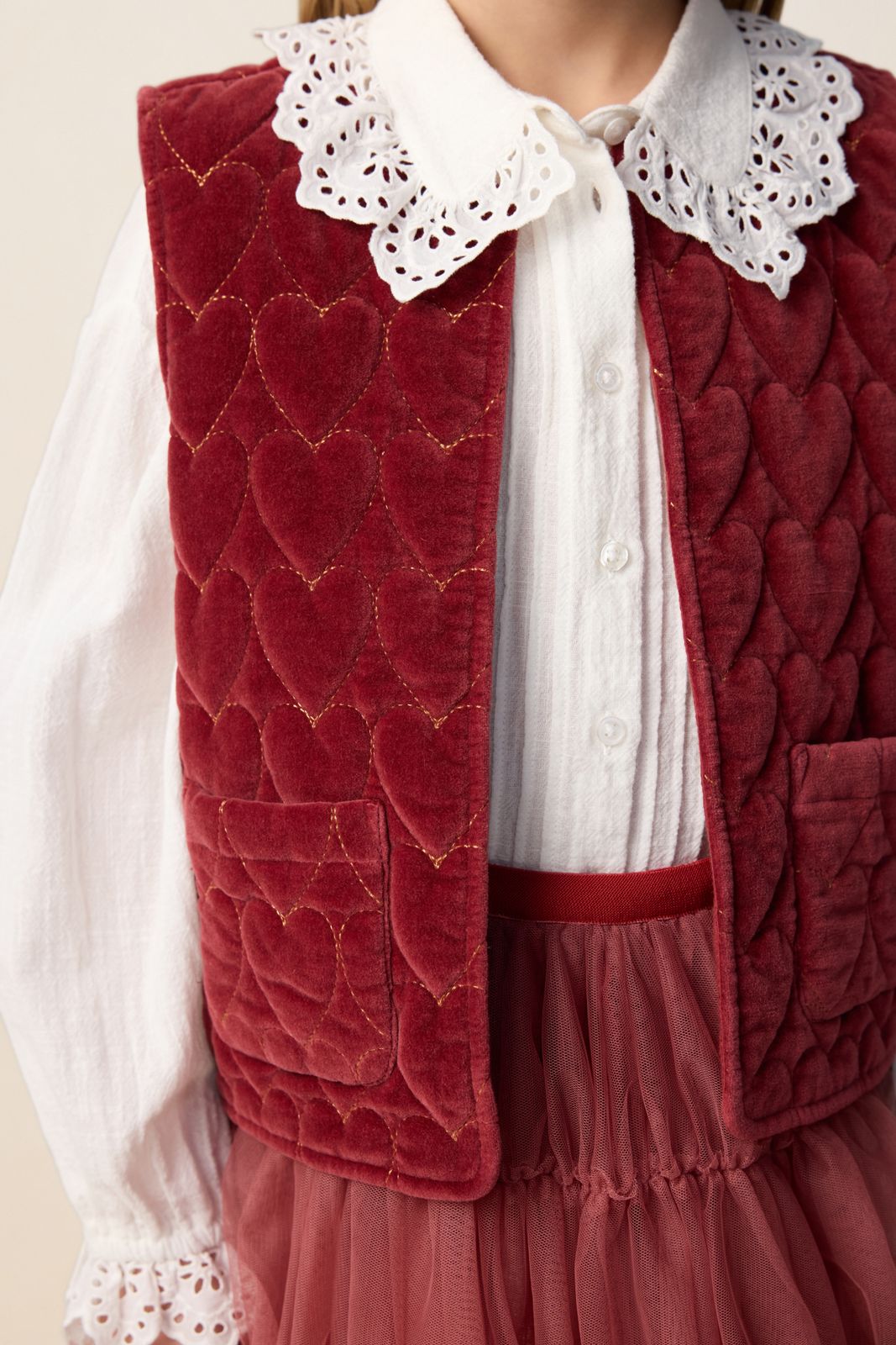 Donkerrood velvet gilet met hartjes van Sissy-Boy. Het gilet heeft een bordeaux rode kleur met all- over goudkleurige quilted hartjes. Verder heeft het gilet een ronde halslijn, twee opgestikte zakken en is het gemaakt van een velvet kwaliteit. Materiaal: 100% katoen.