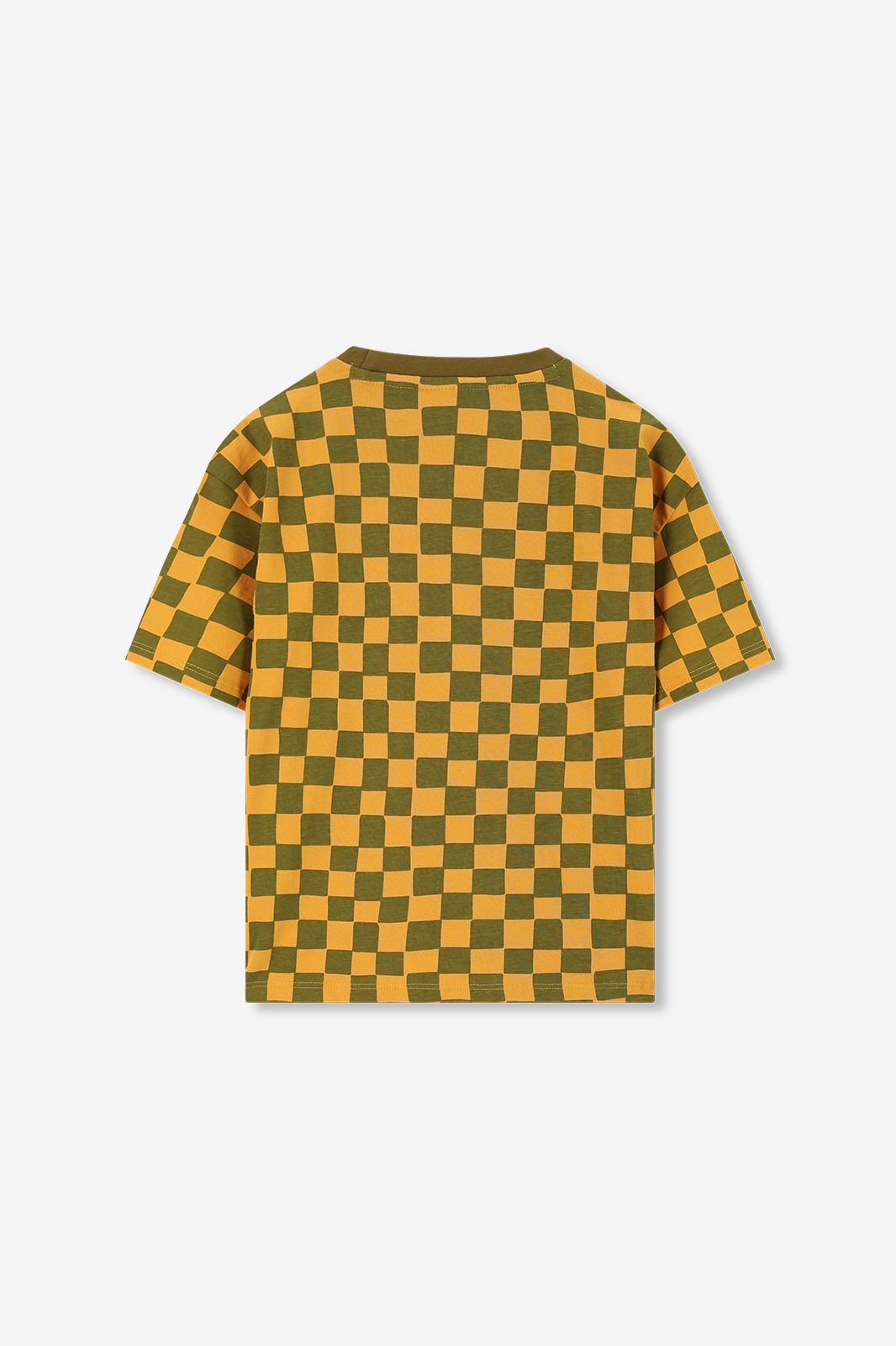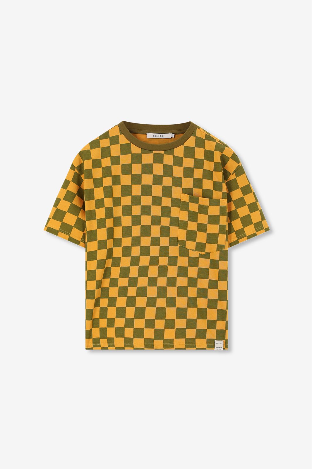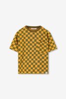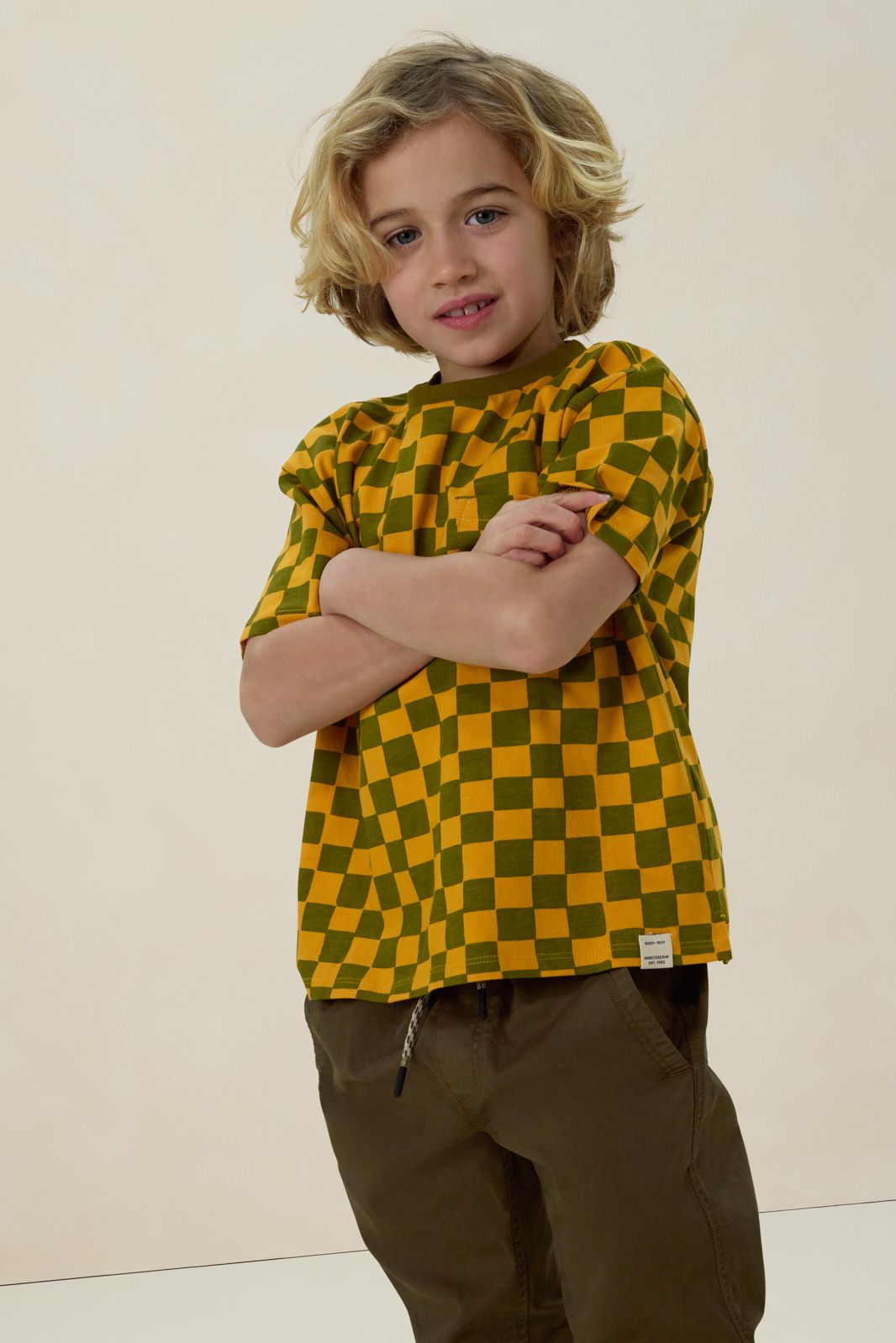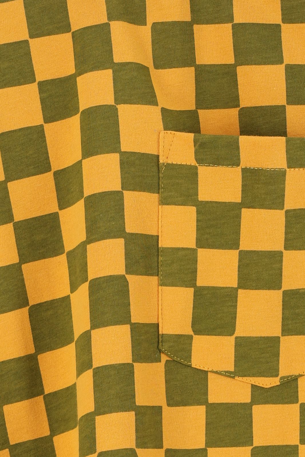 Geel geblokt T-shirt van Sissy-Boy. Het t-shirt heeft korte mouwen, een ronde hals, jersey stofkwaliteit, zakje op de voorzijde en een oversized fit. Verder heeft het een gele kleur met een all-over blokjes print in het groen. Materiaal: 100% katoen.