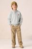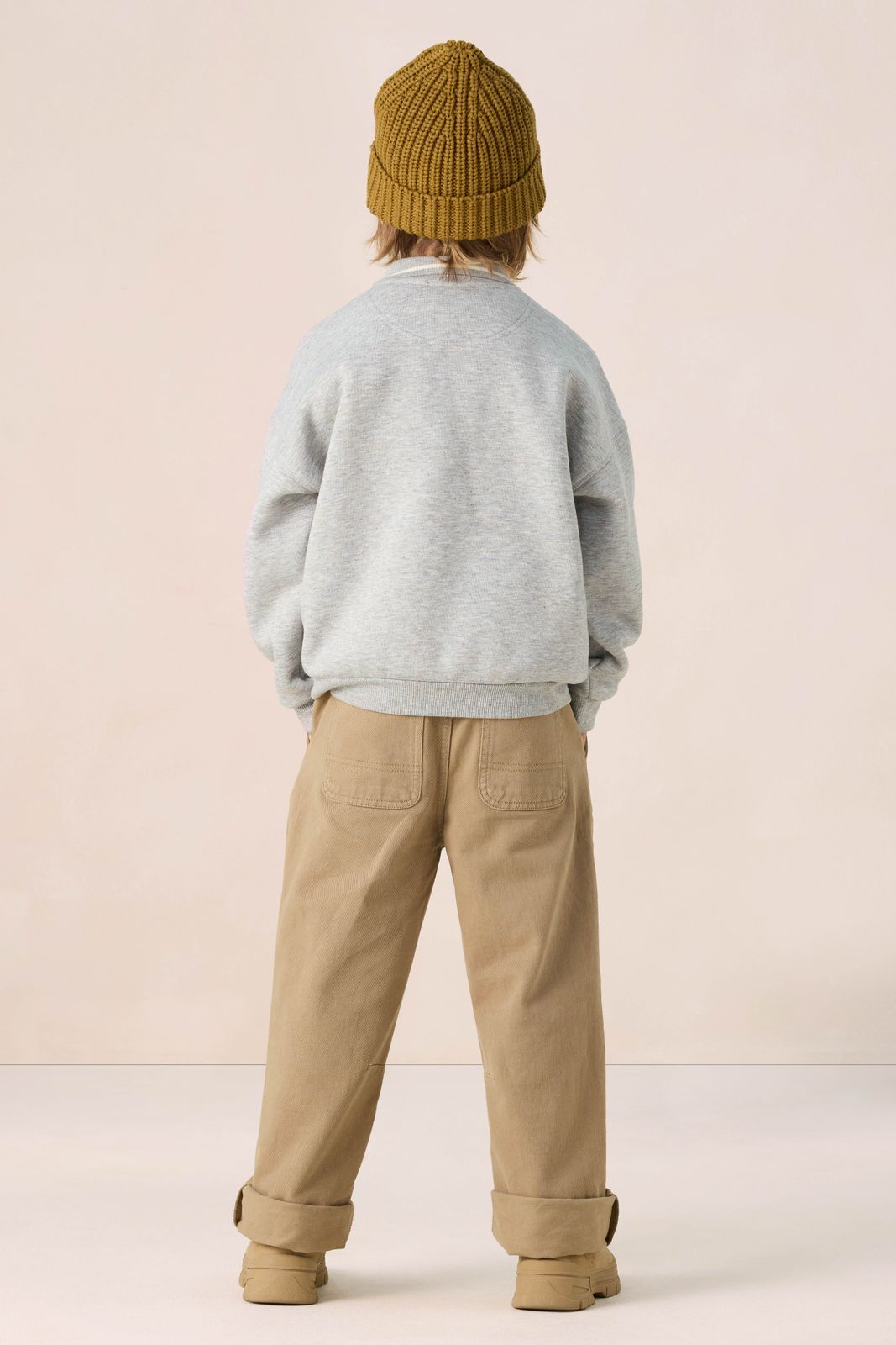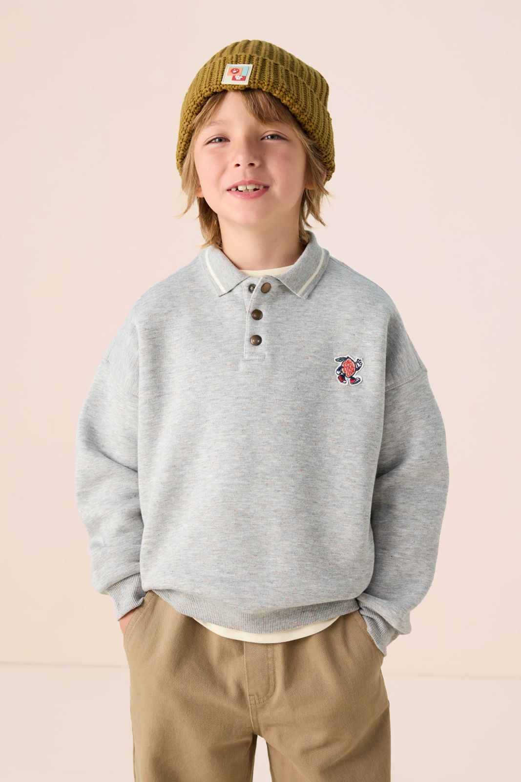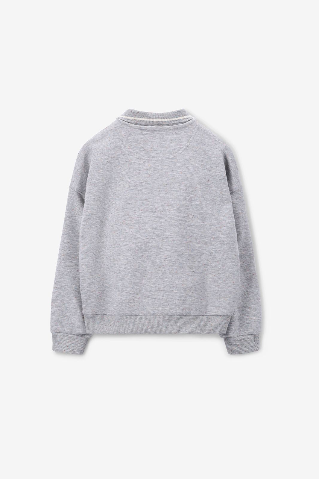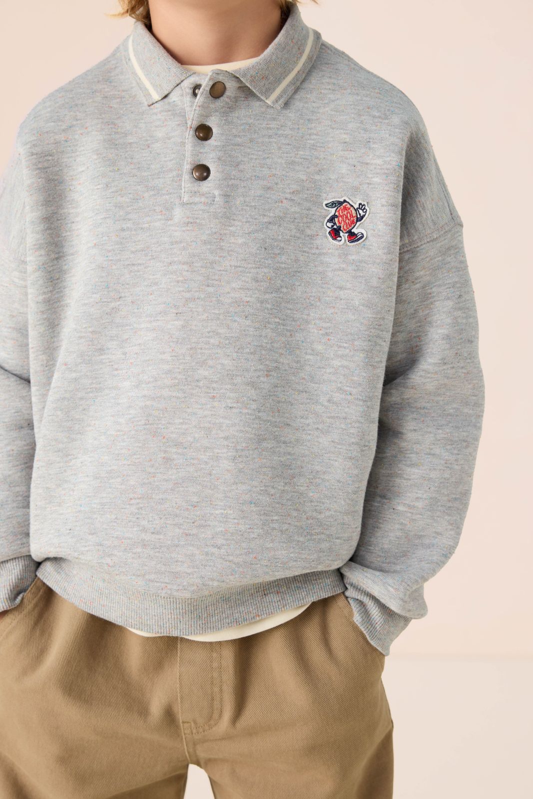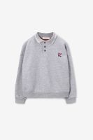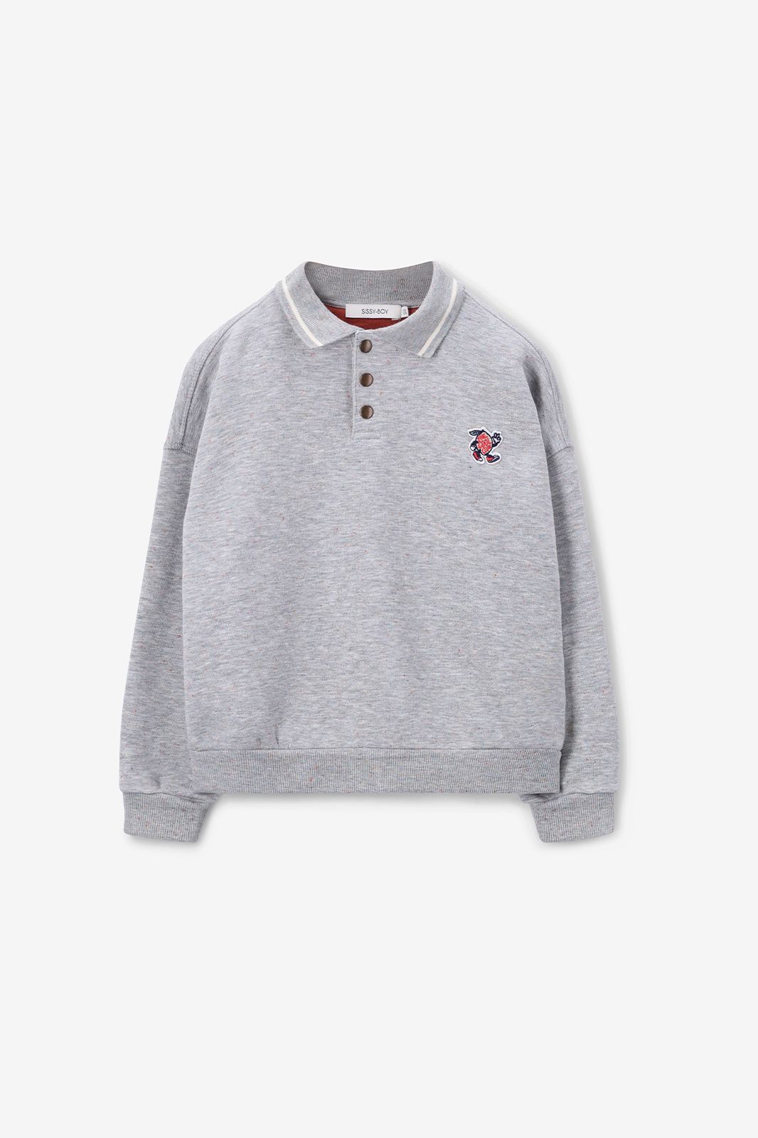 Lichtgrijze sweater met artwork van Sissy-Boy. De sweater heeft lange mouwen, een polo kraag, een knoopsluiting aan de bovenzijde, verlaagde schouders en een relaxed fit. Verder heeft de sweater ribboorden, subtiele kleuren spikkels in de stof verwerkt en een geborduurd artwork op de linkerborst. Materiaal: 46% katoen, 38% viscose, 16% polyester.