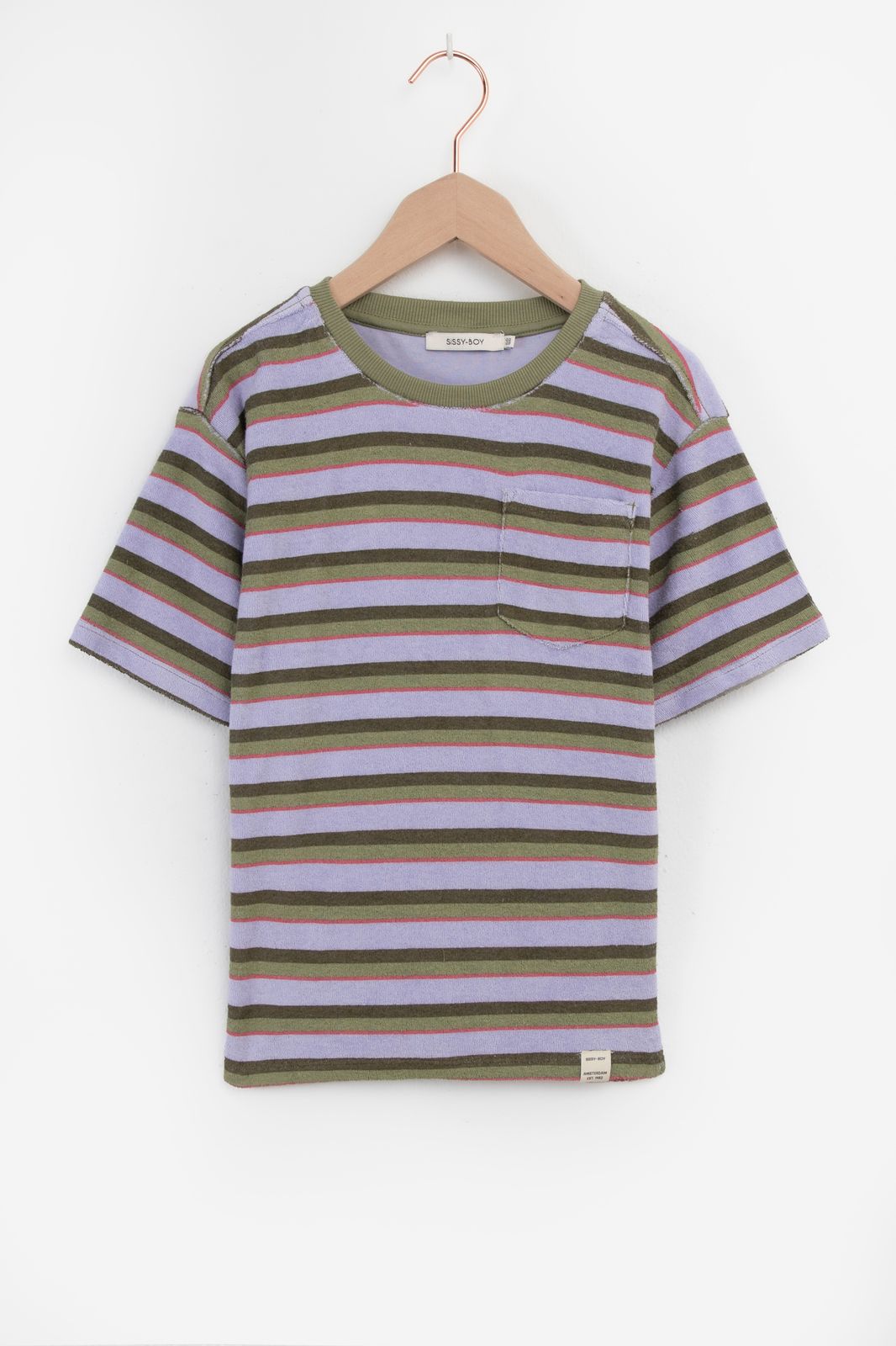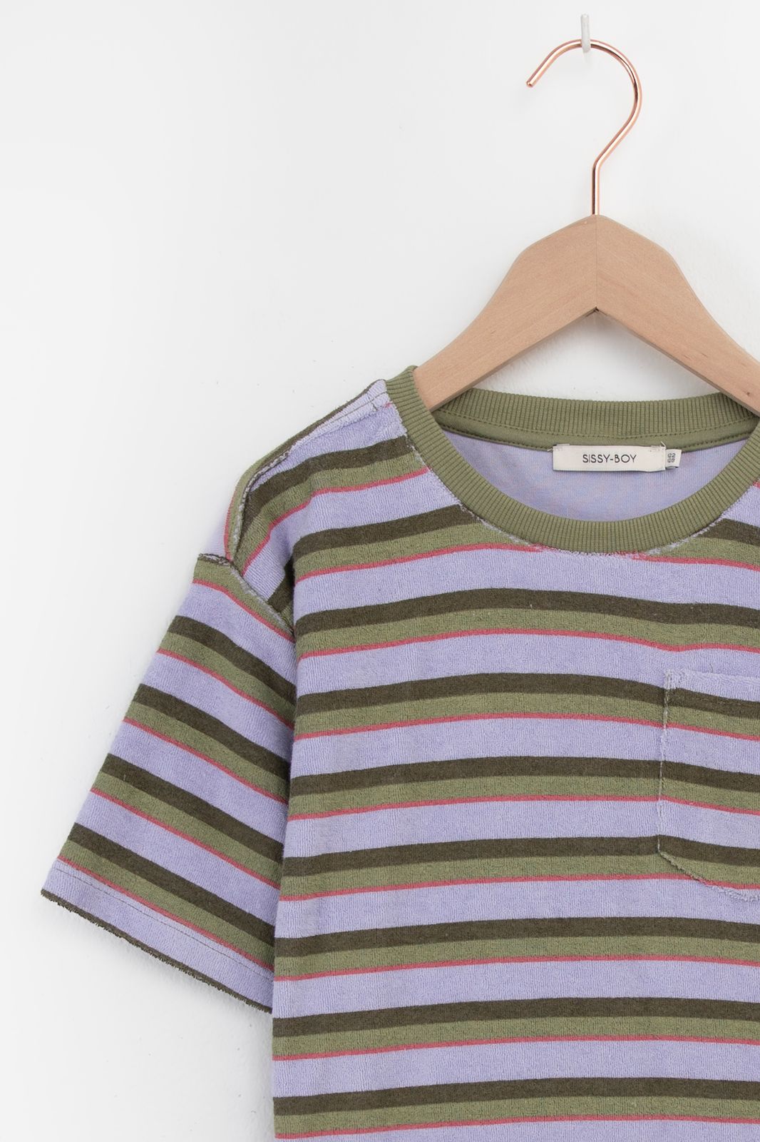 Multicolour gestreept T-shirt in badstofkwaliteit met korte mouwen, een ronde hals en een borstzakje. Materiaal: 100% katoen.