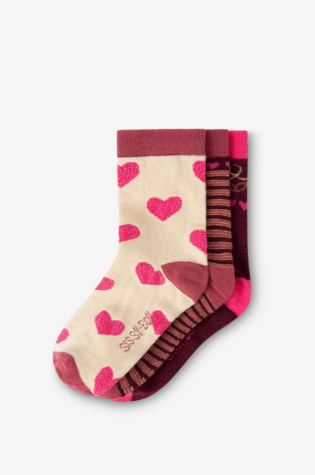 Roze sokken set van 3 van Sissy-Boy. De sokken hebben een roze kleur met een all-over hartjes print. Materiaal: 70% katoen, 27% polyamide, 3% elastaan.