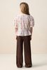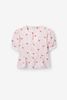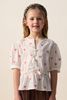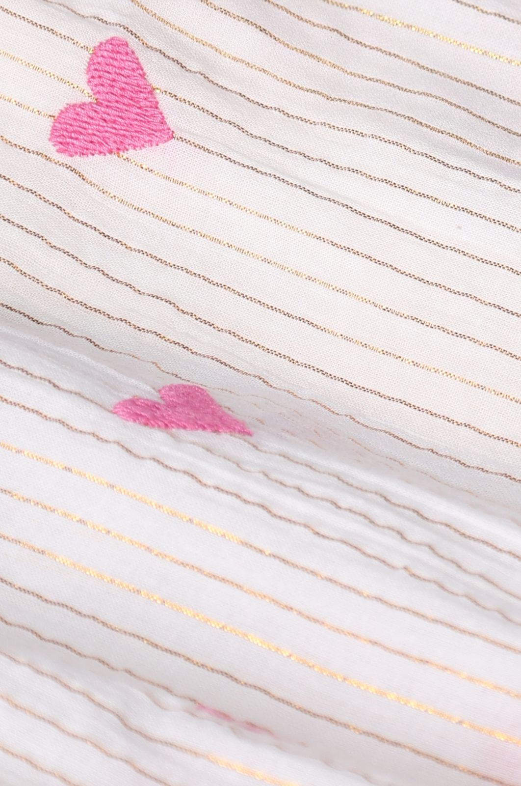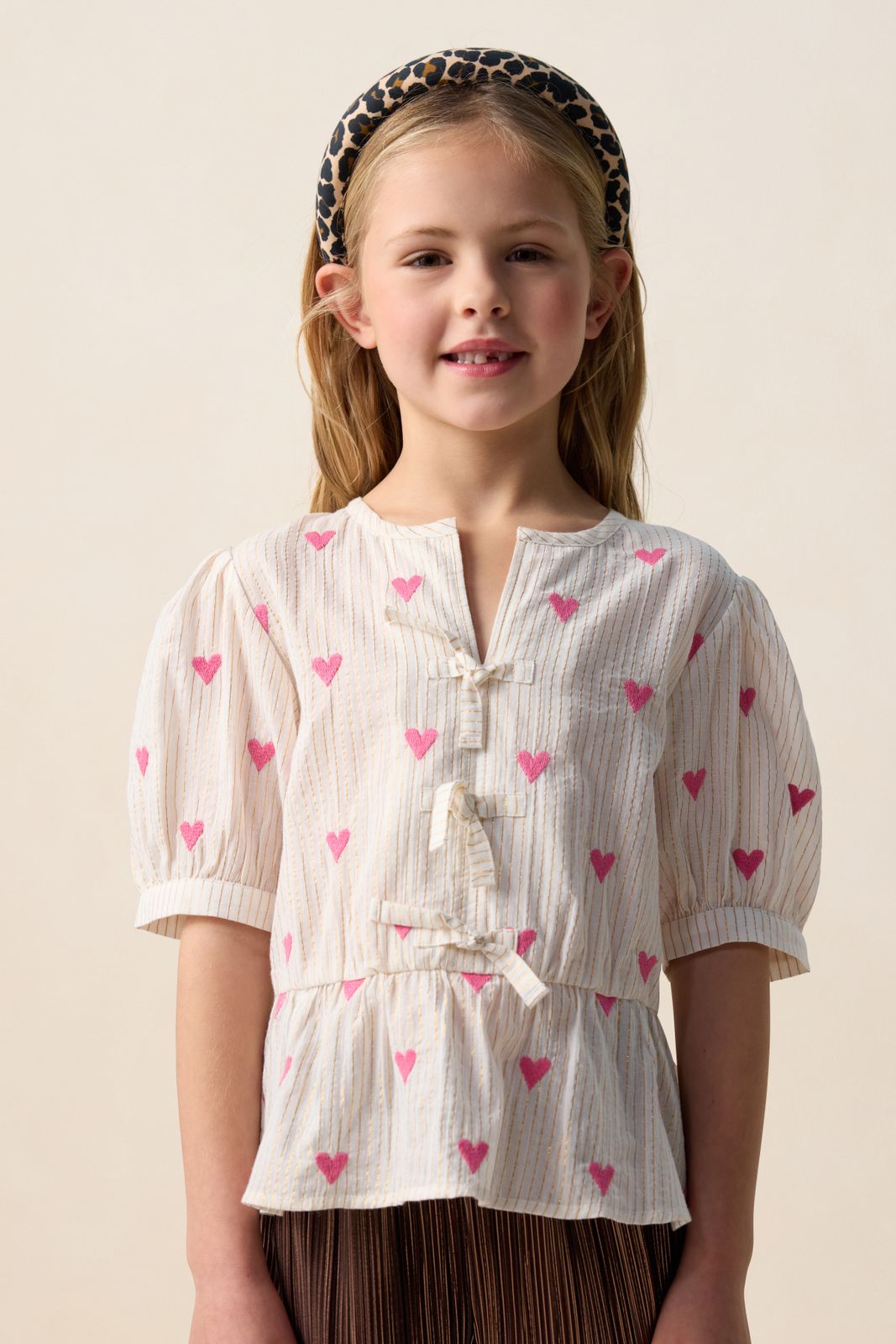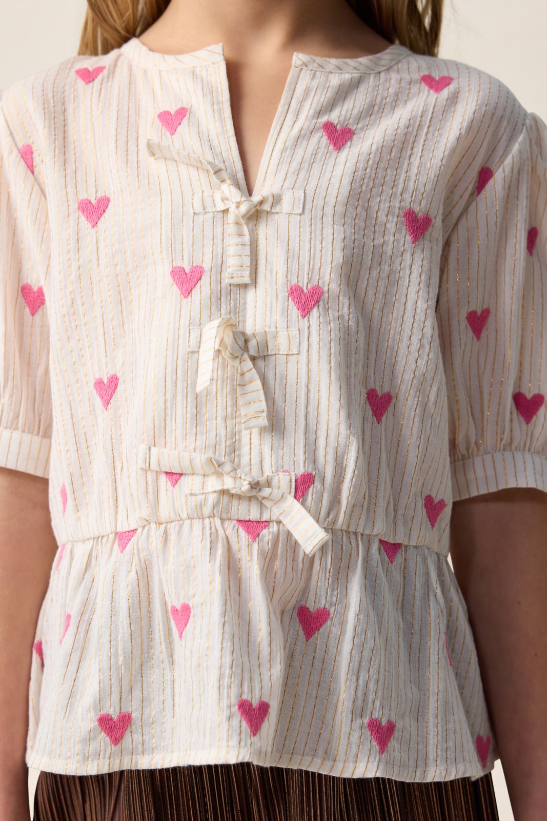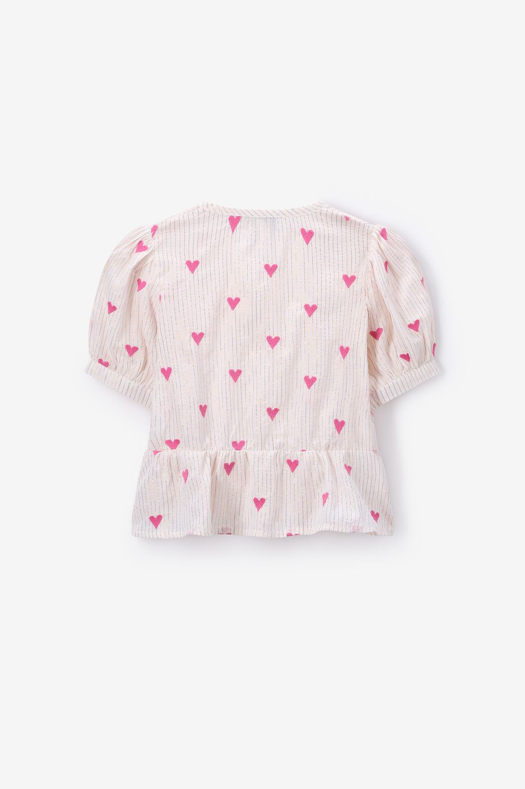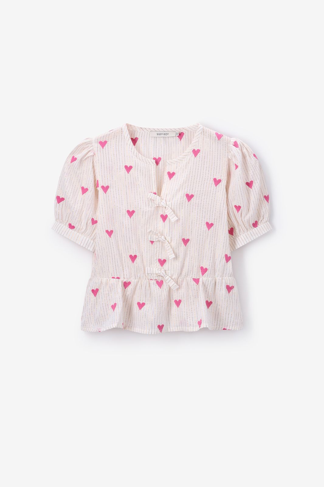 Witte blouse met hartjes van Sissy-Boy. De blouse heeft korte pofmouwen, een ronde hals, ribboorden, striksluiting en een uitlopend detail aan de onderzijde. Verder is de stof voorzien van ingeweven gouden lurex strepen en een all-over hartjes print. Materiaal: 98% katoen, 2% metaaldraad.